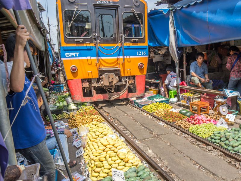 Maeklong Railway actually started out under a private enterprise. However, it fell under the Thai military during WWII and later became nationalized. Today, Maeklong Railway runs from Wongwian Yai station (a short ride from BTS station with the same name) to Maeklong Station. The route is made up of two separate lines (Wongwian Yai - Mahachai & Ban Laem - Maeklong). To ride from one end to the other, you will have to hop off, take a ferry across Tha Chin river and hop on another train.