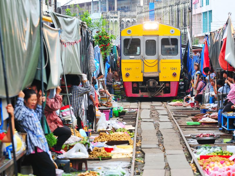 Perhaps Maeklong Railway’s major claim to fame, however, is the Maeklong Railway Market. Called “Talad Rom Hub” in Thai, or literally, “Folding Umbrella Market”, the fresh market does live up to its name. Rows and rows of huge “umbrellas” or sun shades with stalls of fresh produce sit right along both sides of the railway. Every time the train comes, it becomes a one-of-a-kind highlight the market is known for. The umbrellas fold and the vendors pull everything away in a split second - making it the iconic picture you might have seen several times. When the train is gone, everything goes right back into place! Other than the trains running through the market, you’re sure to find fresh vegetables and fruits, meats, seafood, Thai desserts, and even a few souvenirs to take home!