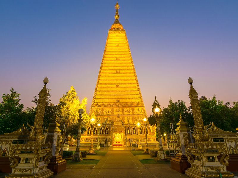 Here at Wat Phra That Nong Bua, you’ll find a 56-meter high golden Thai-style replica of Sri Mahabodhi Temple, Lord Buddha’s enlightenment place in Bodh Gaya, India. Do get there early to beat the crowd and immerse yourself in the serenity, and marvel at the golden reflections while the sunlight gleams over this architectural masterpiece. Take time to admire the stupa’s pristine gold on white decoration, as it’s the only one in Northeastern Thailand
