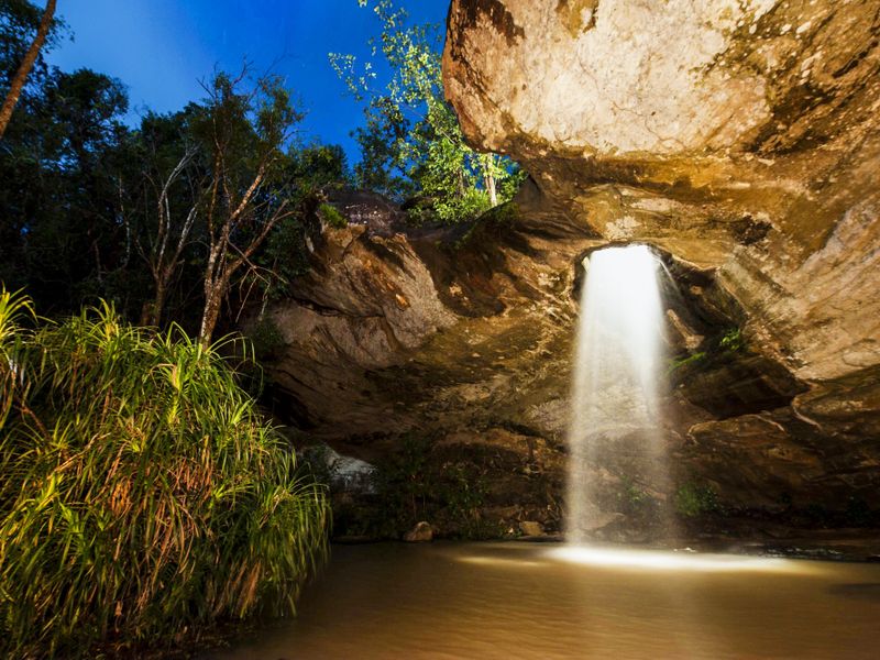 "Moonlight Waterfall", the literal translation of this waterfall perfectly describe its otherworldly features. The streams fall through a hole on the rock. The hole also looks like a full moon, especially on a full moon night when the light shines right through the hole, casting an ethereal gleam on the water surface.